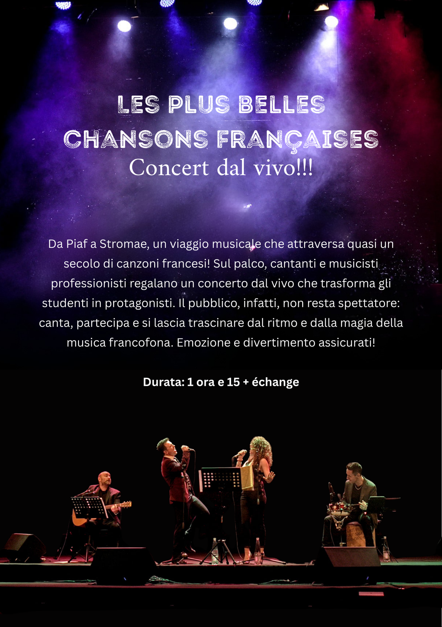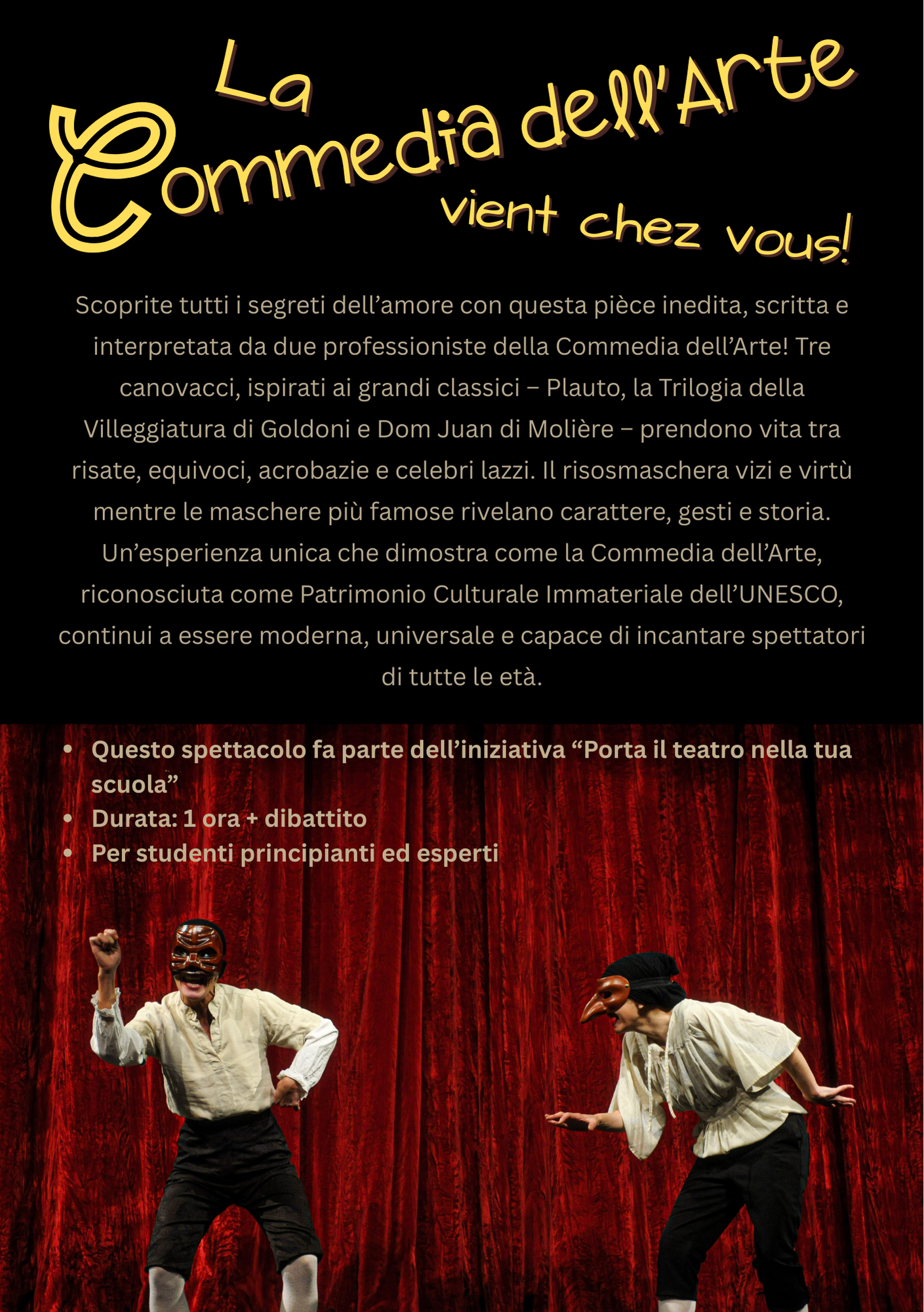 Les spectacles L’Étranger, La Commedia et le concert de chansons françaises se déplacent selon les demandes des écoles.