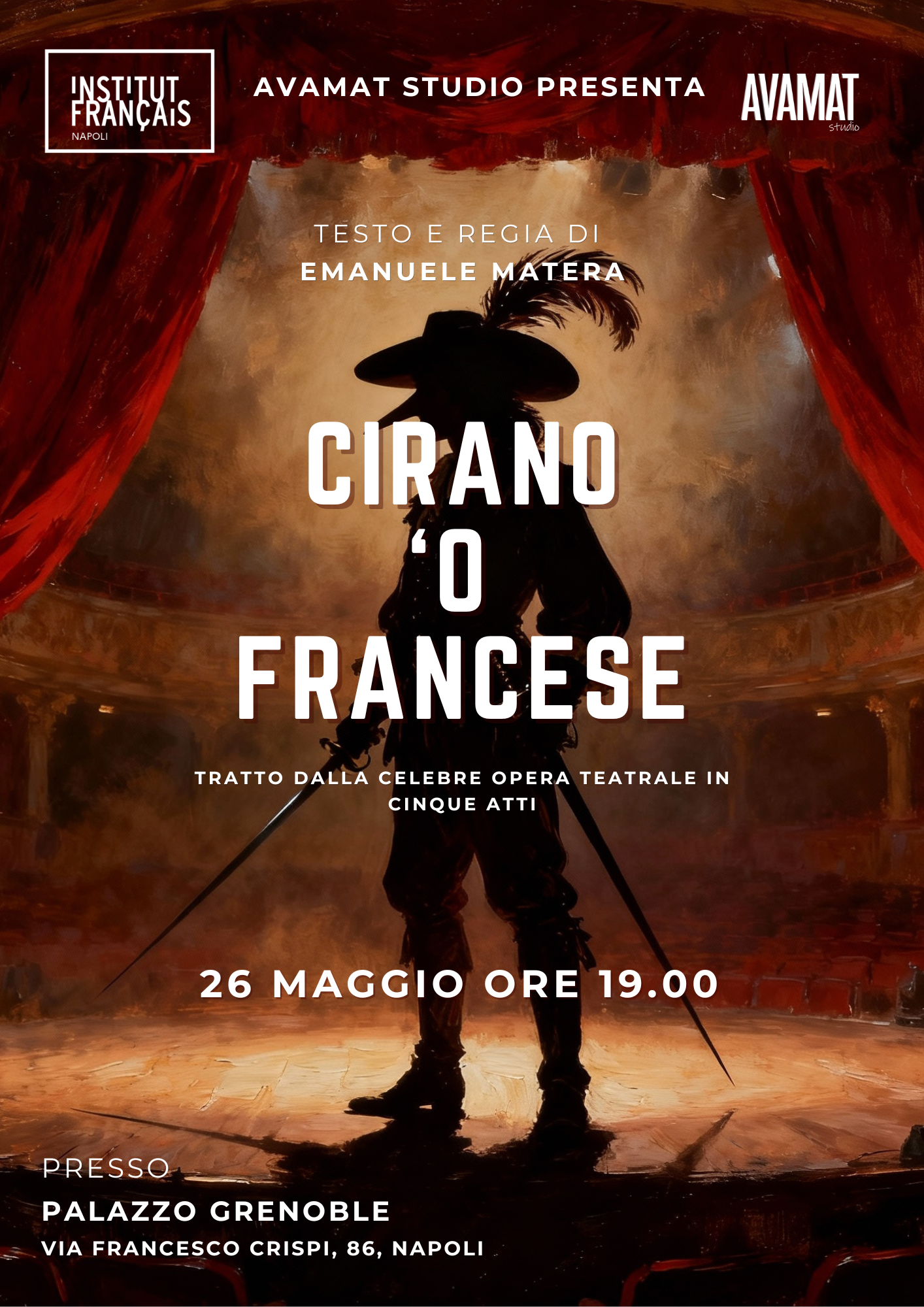 L’Institut Français Napoli ospiterà a Palazzo Grenoble Cirano ’o Francese, spettacolo ispirato a Cyrano de Bergerac di Edmond Rostand e ambientato nella Napoli del Seicento, tra la rivolta di Masaniello e la breve Repubblica Napoletana.