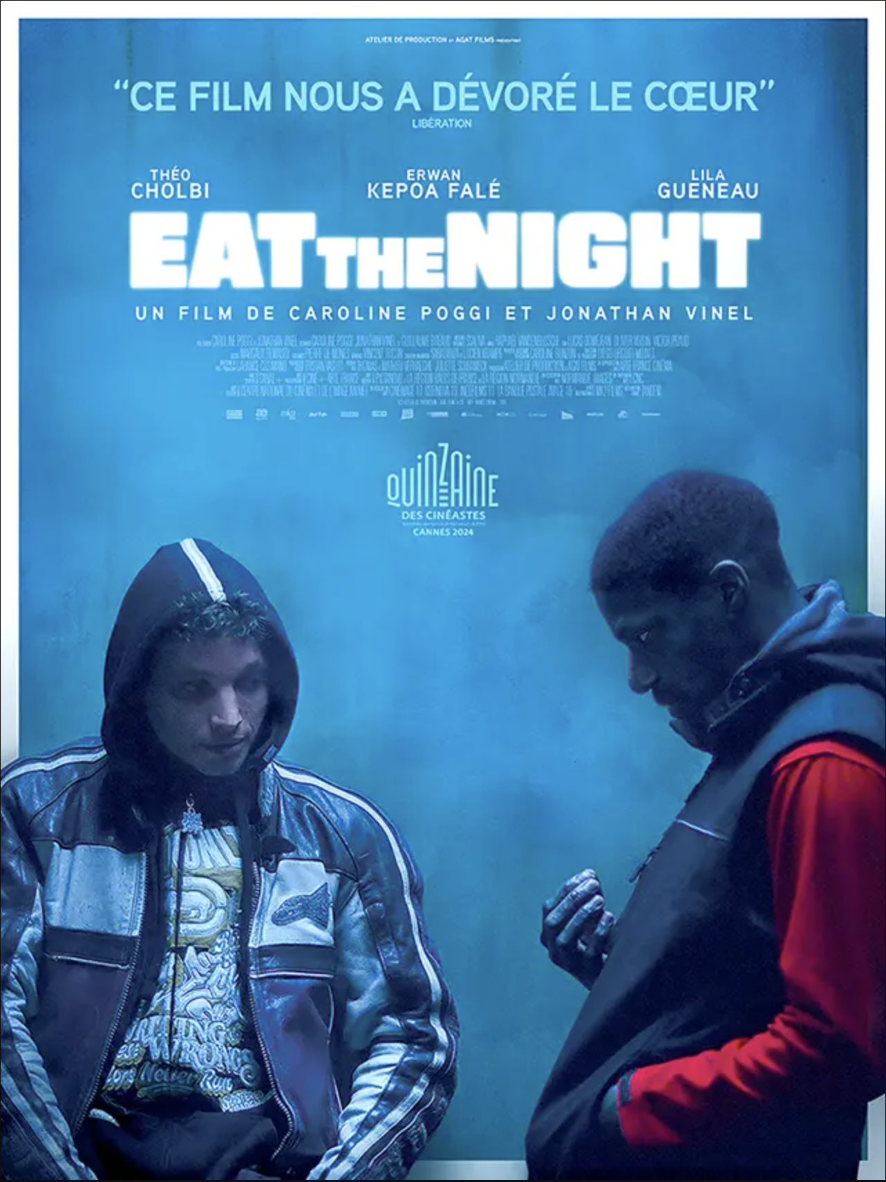 Unico sulla scena cinematografica francese, il duo Poggi et Vinel interroga da dieci anni la malinconia di una gioventù cresciuta agli albori dei mondi virtuali. La cultura di Internet dei primi anni Duemila pervade il lavoro del duo, dai primi cortometraggi con la loro estetica emo-geek e, passando per le installazioni, fino al loro primo lungometraggio, Jessica Forever. Eat the Night è un progetto ambizioso per il giovane cinema francese, che ci immerge nel mondo di Darknoon, un videogioco multiplayer fantasy eroico in 3D appositamente progettato per il film. Molto fisico e dal ritmo intenso, Eat The Night si muove abilmente tra il suo affascinante universo virtuale (in particolare con un finale apocalittico mozzafiato) e la vita quotidiana nichilista in cui si dibattono i protagonisti. Molto più narrativo del film precedente, Eat the Night mantiene un desiderio di ibridazione, giustapponendo mondi diversi e navigando tra cyber teen-movie, thriller allucinatorio e melò queer. È un film apocalittico, sullʼaddio allʼadolescenza, ma anche un vero e proprio film dʼamore, girato nellʼatmosfera surreale di Le Havre.
