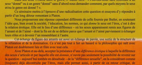 Università, ricerca, innovazione Palermo L'échange de figure Différence érotique et différence sexuelle entre philosophie et littérature 23 Aprile, 17:00 Séminaire de Rosaria Caldarone, directrice de programme au Collège International de Philosophie.