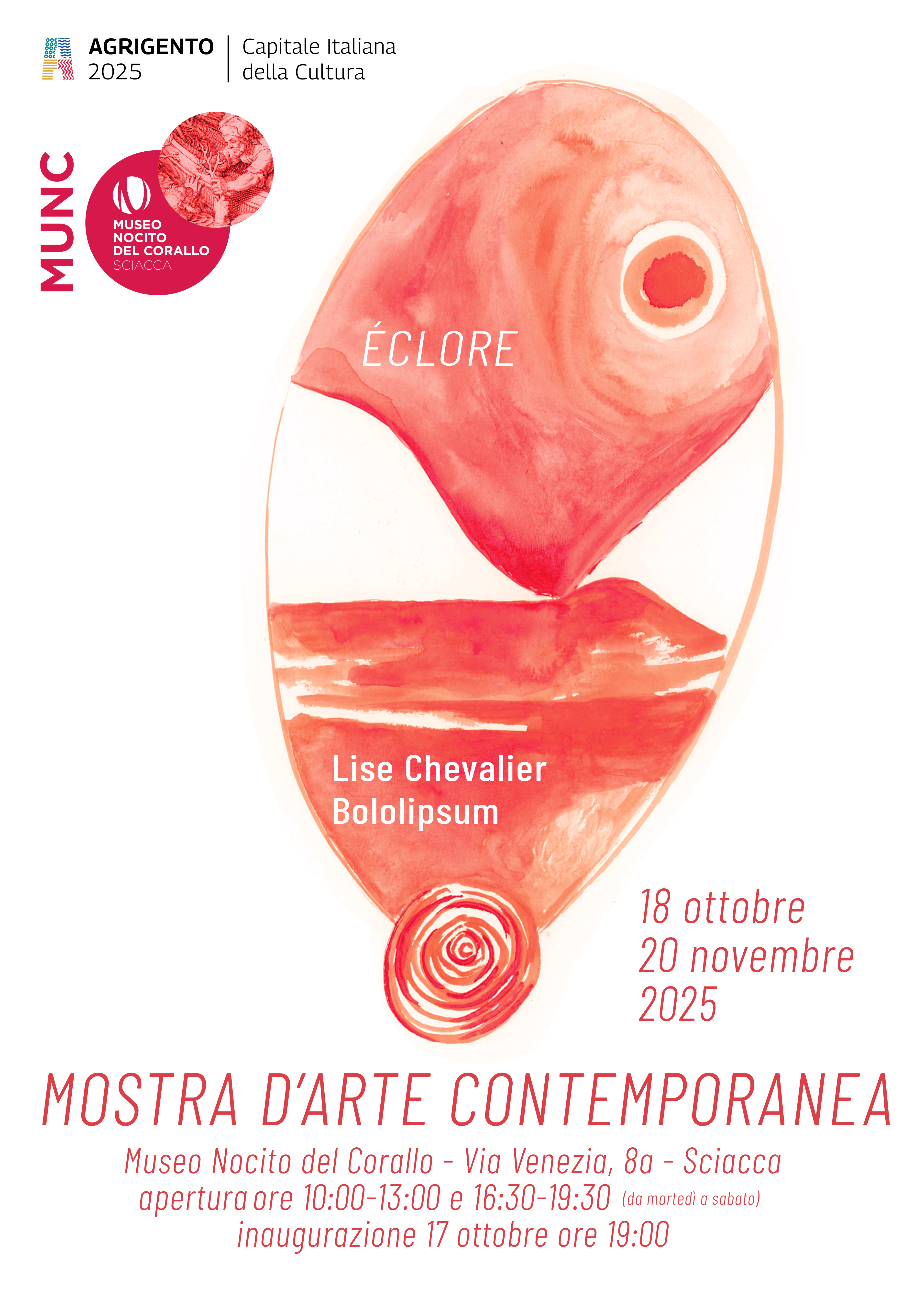 Éclore (Fiorire) è un progetto ideato dall’artista plastica francese Lise Chevalier, invitata in residenza nella città di Sciacca, vicino ad Agrigento, per lavorare sull’artigianato del corallo e l’arte ceramica nell’ambito di Agrigento Capitale Italiana della Cultura 2025. L’artista è animata da una pratica artistica legata al mondo vivente e il suo progetto di residenza verte sulla singolare storia del corallo della città di Sciacca e sulla riproduzione dei coralli, fondamentale per la sopravvivenza degli ecosistemi sottomarini. Le tecniche utilizzate sono la gioielleria, la ceramica, la pittura a inchiostro e la creazione sonora. Invita il musicista Bololipsum a unirsi a lei in residenza per creare un’installazione sulla riproduzione dei coralli in relazione all’universo sottomarino di Sciacca. Bololipsum realizzerà anche due performance musicali inedite.