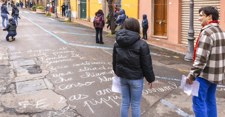 Attraverso una linea tracciata con il gesso che gli studenti hanno chiamato «La Via dell’acqua», la loro scrittura ha seguito il percorso dell’acqua nella città. Un modo poetico per rendere visibile l’invisibile, ma anche per ricreare legami : tra le generazioni, tra gli abitanti, tra la lingua e il mondo vivente.